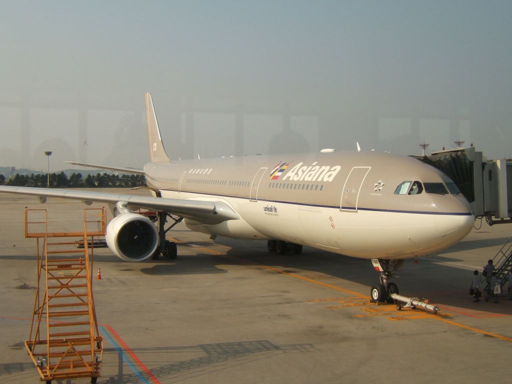 の待ち時間を利用し、双眼鏡とデジカメを下げうろうろ。 搭乗機のアシアナ航空の